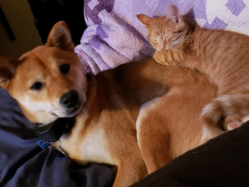 He's only about 10lbs. The cat is currently his BFF LOL I think he thinks that he is a cat sometimes.